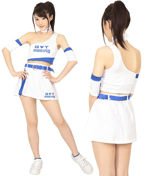 白に青のポイントカラーが爽やかな、レースクイーン衣装!ピッタリと胸元にフィットするトップスは、セクシーさを忘れないワンショルダーデザイン!わき腹、おヘソを露出するセパレートタイプになっていて、ミニ丈スカートにもこだわりの青を挿し色に。