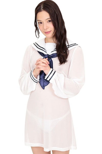 水で濡れたように透け感のある極薄仕様のセーラーワンピ(白)。