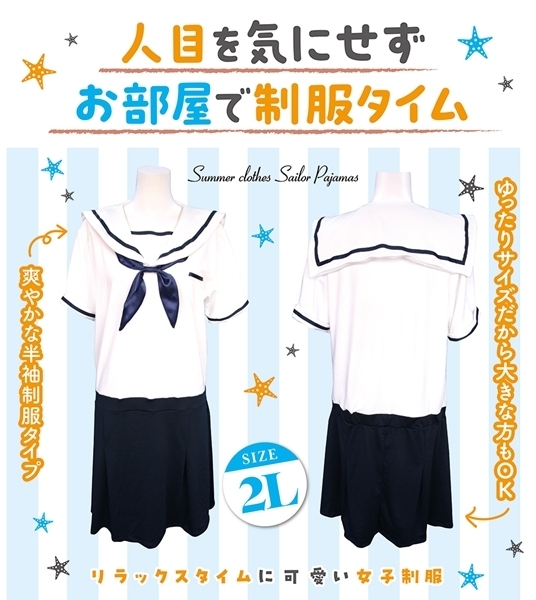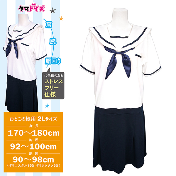 見た目の可愛さと快適な着心地を両立したルームウェアです!伸縮性と通気性に優れた生地を採用し長時間の着用でもムレにくく快適です♪肩や腕、胴まわりにゆとりを持たせた設計でストレスのない着心地を実現しています!2Lサイズは身長170〜180cm、胸囲92〜100cm、胴囲90〜98cmに対応し、大きめの方でも安心です♪セーラーカラーのデザインが爽やかでパジャマとしてはもちろん、コスチュームとしても楽しめます!ゆったりしたシルエットがリラックスタイムにぴったりで肌ざわりもなめらか♪おとこの娘向けに調整された設計で自然なフィット感が魅力の一着です!●TAMS-1337